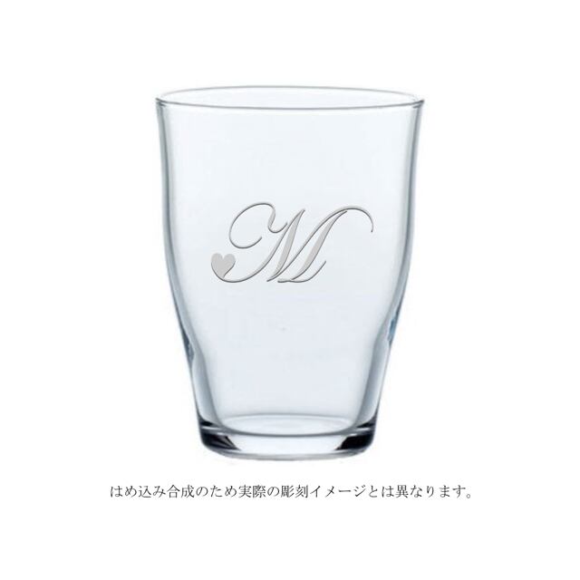 アルファベットイニシャル1文字にハートのアクセントを入れたサンドブラスト彫刻のスタイリッシュなグラスです。
